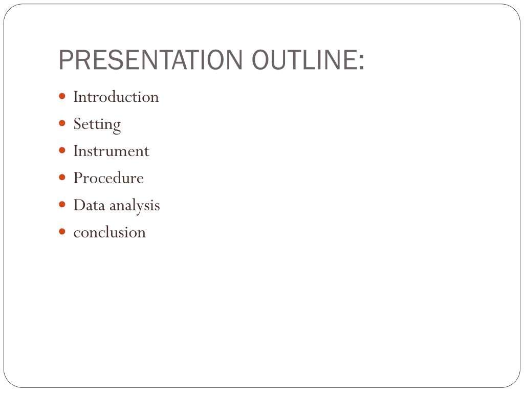 PRESENTATION OUTLINE: • Introduction • Setting • Instrument • Procedure • Data analysis • conclusion
