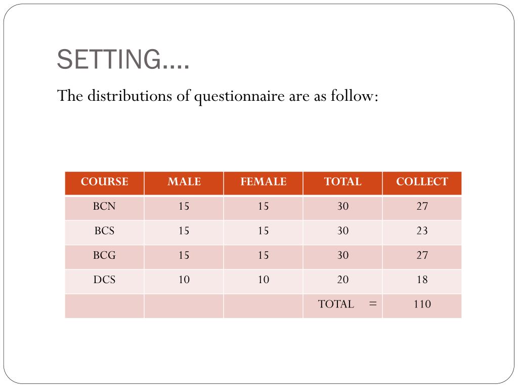 PROCEDURE… Know our RQ Sent out questionnaire Find questionnaire Approve Collect the questionnaire Complete and go to next step