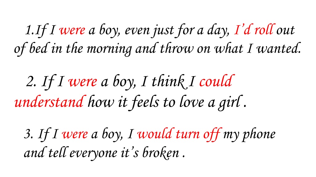 1.If I were a boy, even just for a day, I’d roll out of bed in the morning and throw on what I wanted. 2. If I were a boy,I think I could understand how it feels to love a girl . 3. If I were a boy, I would turn off my phone and tell everyone it’s broken .