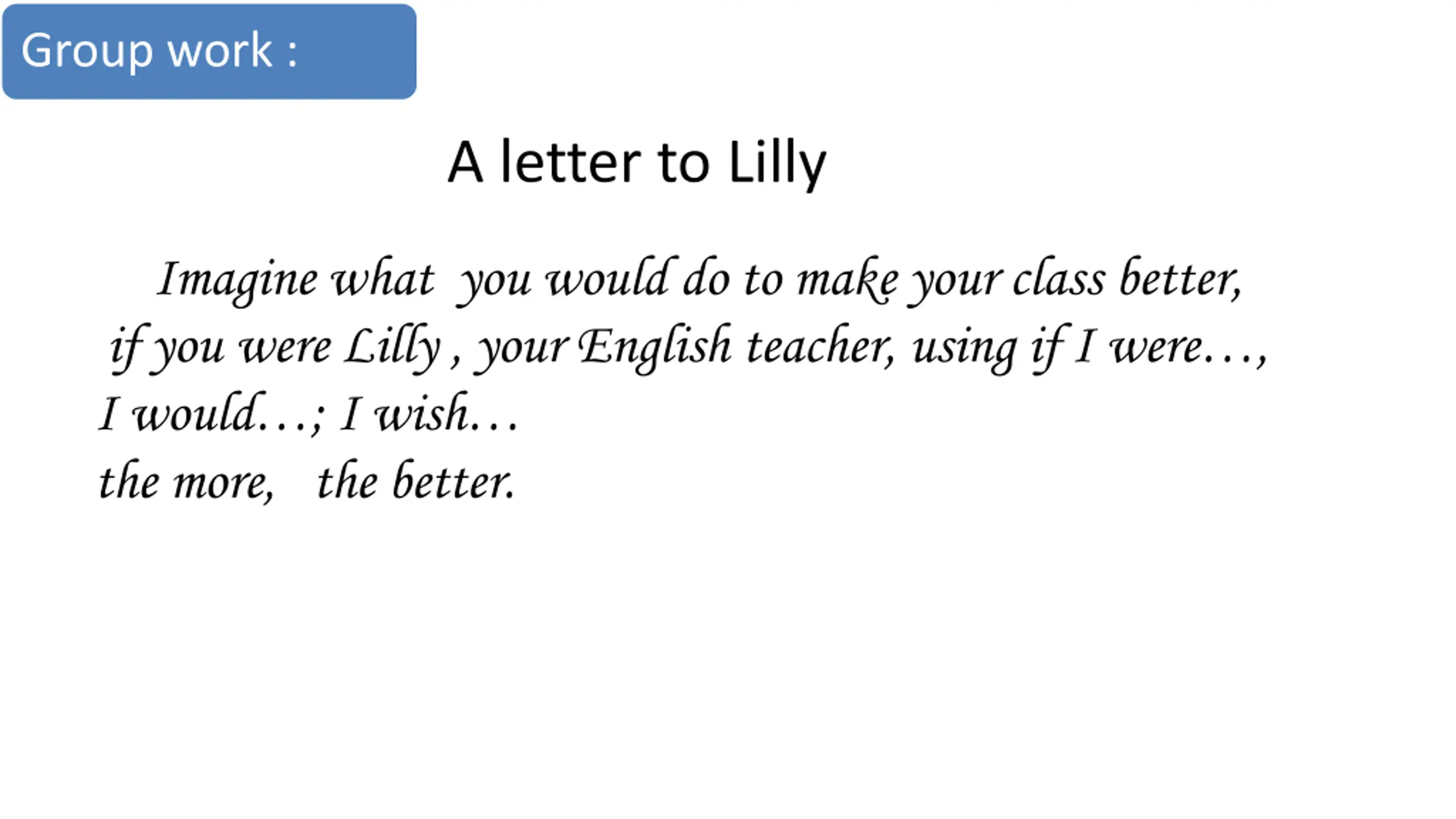 Group work : A letter to Lilly Imagine what you would do to make your class better, if you were Lilly , your English teacher, using if I were…, I would…; I wish… the more, the better.