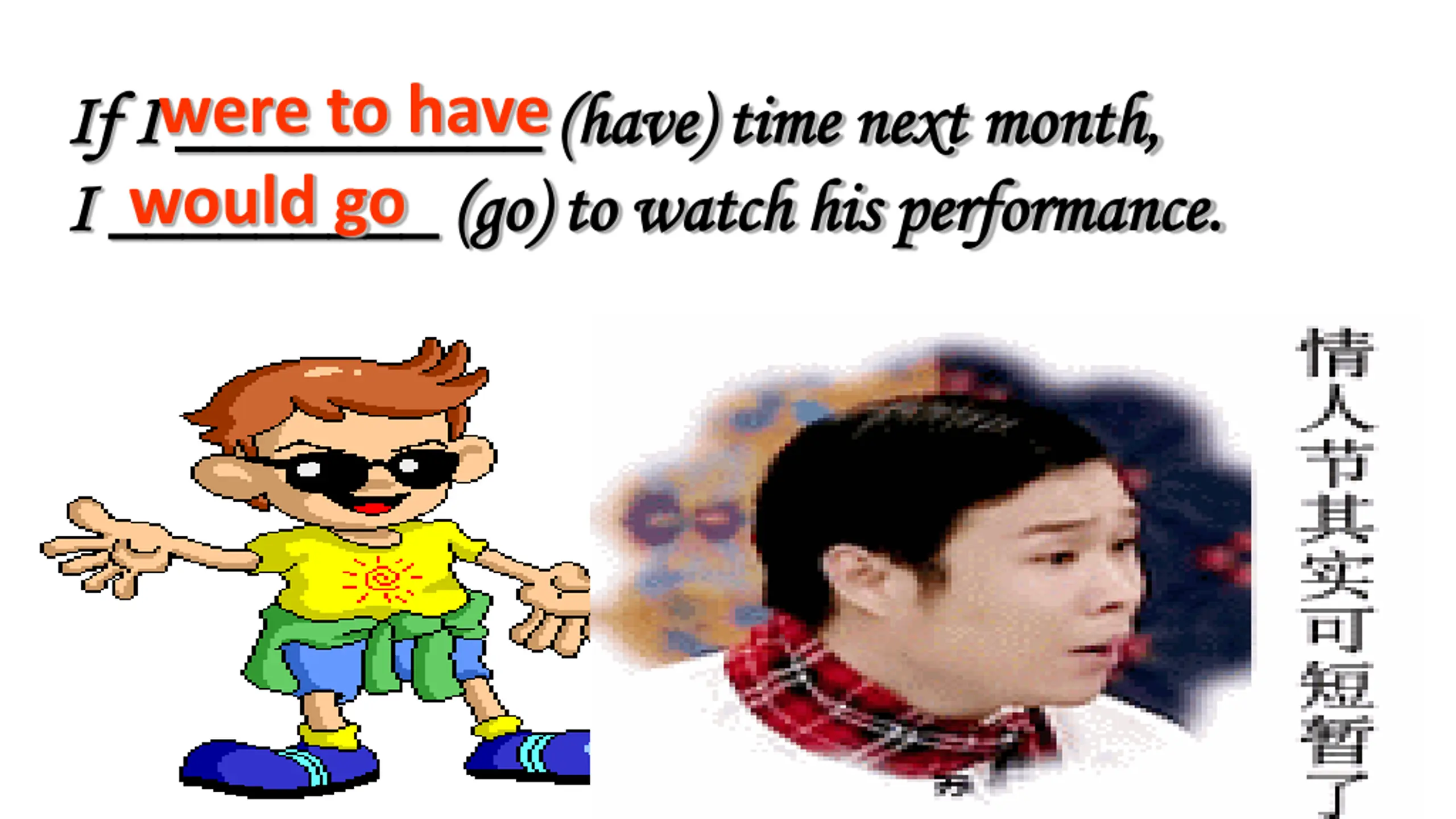 were to have If I __________ (have) time next month, If I __________ (have) time next month, I I _________ (go) to watch his performance. _________ (go) to watch his performance. would go