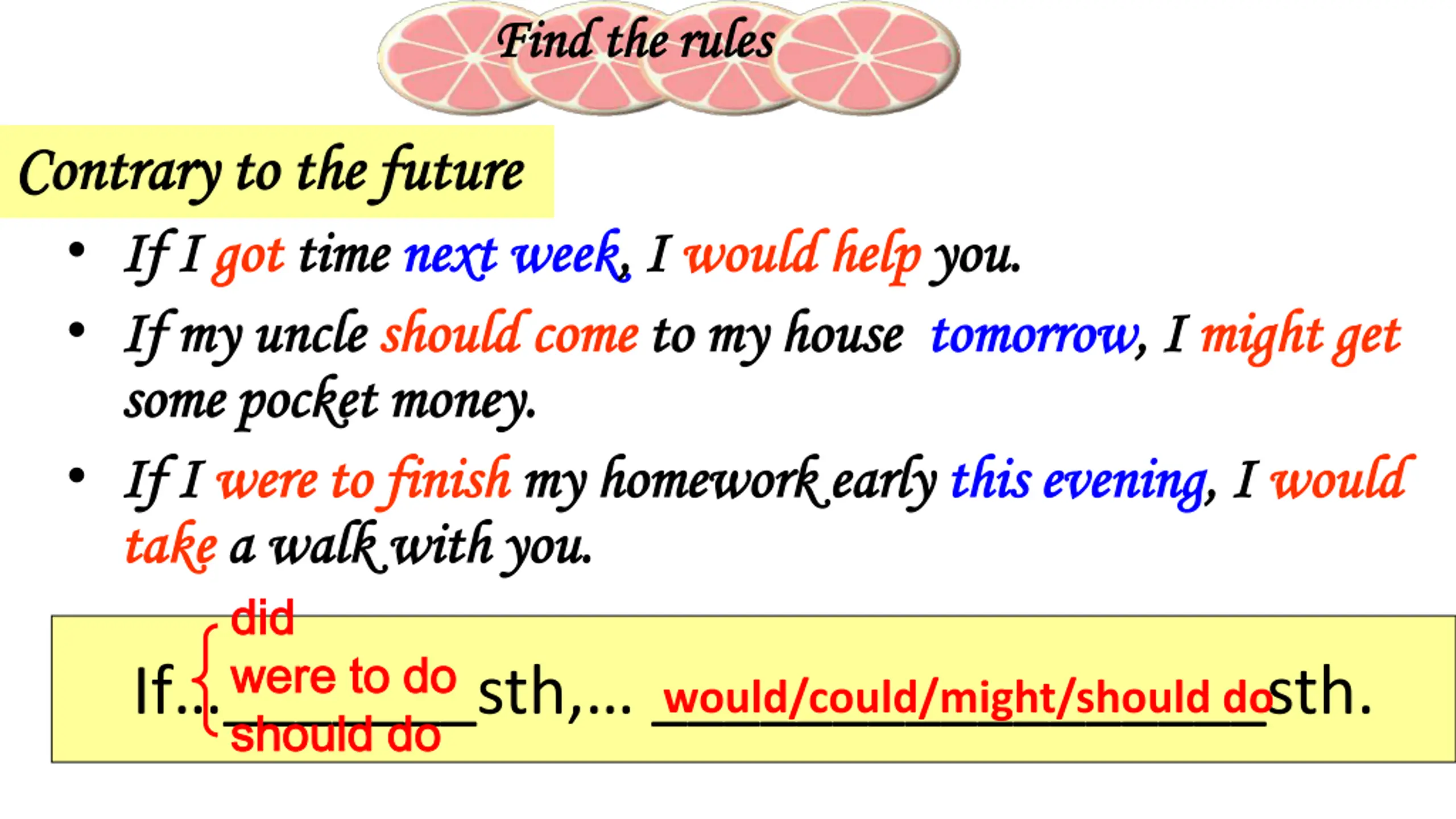 Find the rules Find the rules Contrary to the future Contrary to the future • If I If I got • If my uncle If my uncle should some pocket money. some pocket money. • If I If I were to finish were to finish my homework early take take a walk with you. a walk with you. did did were to do were to do should do should do got time time next week next week, I should come , I would help would help you. come to my house to my house tomorrow you. tomorrow, I , I might get might get my homework early this evening this evening, I , I would would If…_______sth,… _________________sth. would/could/might/should do