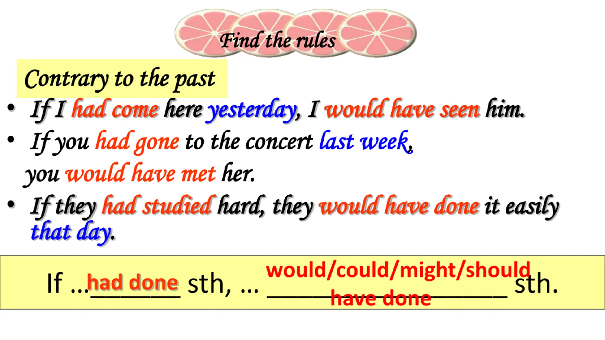 Find the rules Find the rules Contrary to the past Contrary to the past • If I If I had come had come here • If you If you had gone had gone to the concert you you would have met would have met her. • If they If they had studied had studied hard, they that day that day. . here yesterday yesterday, I to the concert last week her. hard, they would have done would have done it easily , I would have seen would have seen him. last week, , him. it easily would/could/might/should have done If …______ sth, … ________________ sth. had done