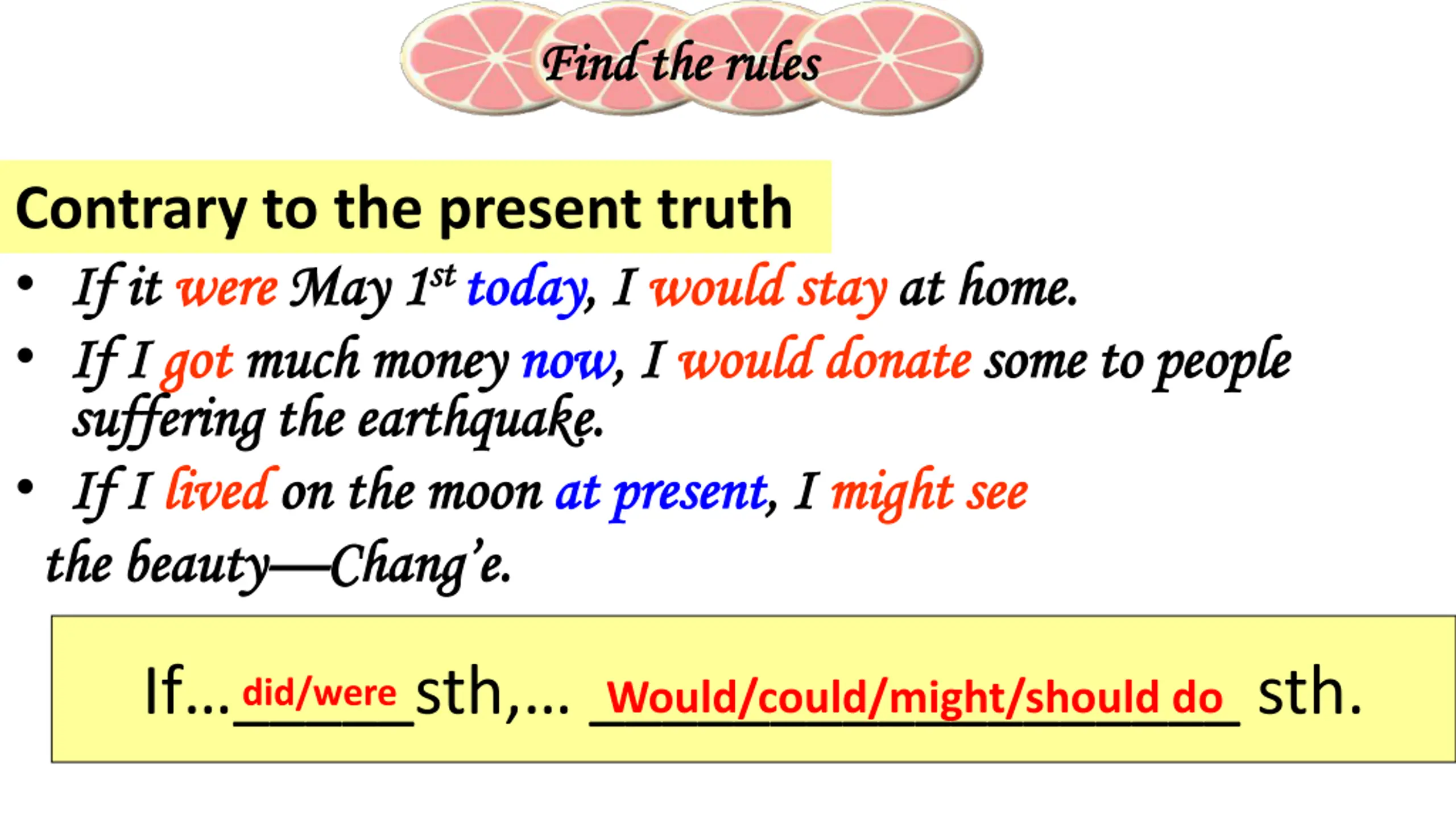 Find the rules Find the rules Contrary to the present truth • If it If it were • If I If I got suffering the earthquake. suffering the earthquake. • If I If I lived lived on the moon on the moon at present the beauty the beauty— —Chang’e. Chang’e. were May 1 May 1st st today got much money much money now today, I now, I , I would stay would stay at home. , I would donate would donate some to people at home. some to people at present, I , I might see might see If…_____sth,… __________________ sth. did/were Would/could/might/should do