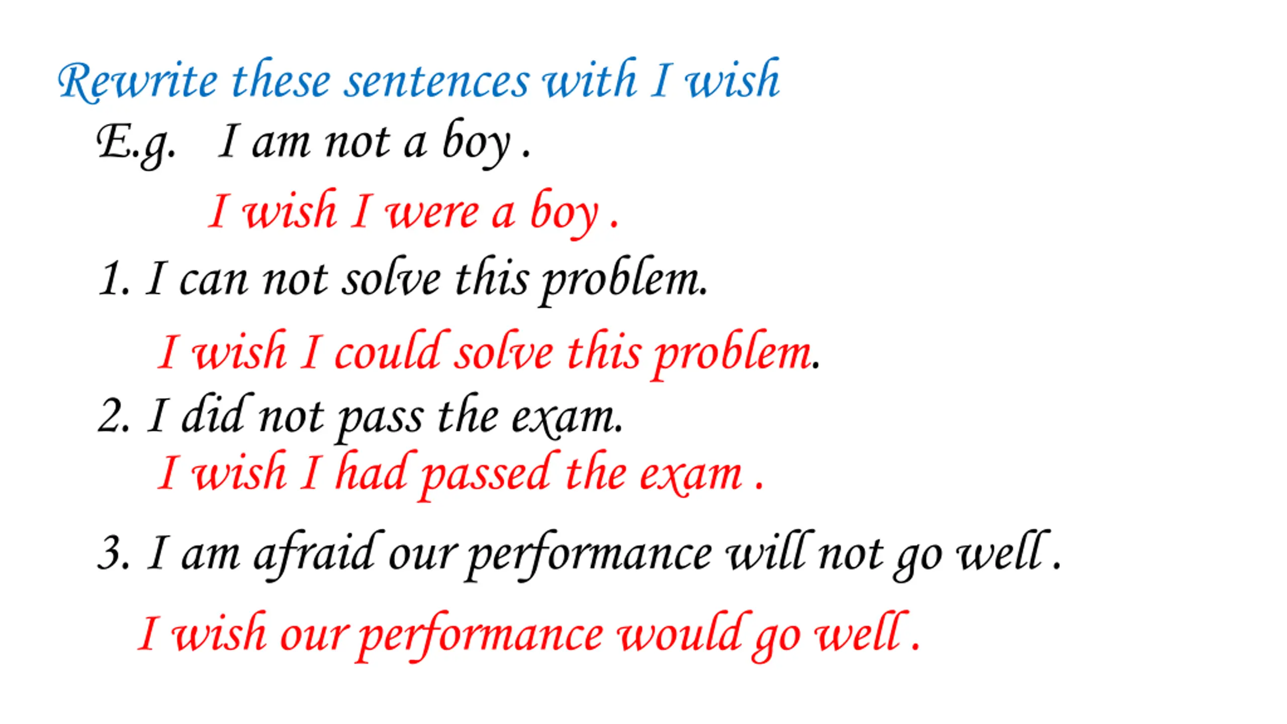 Rewrite these sentences with I wish E.g. I am not a boy . I wish I were a boy . 1.I can not solve this problem. I wish I could solve this problem. 2. I did not pass the exam. I wish I had passed the exam . 3. I am afraid our performance will not go well . I wish our performance would go well .