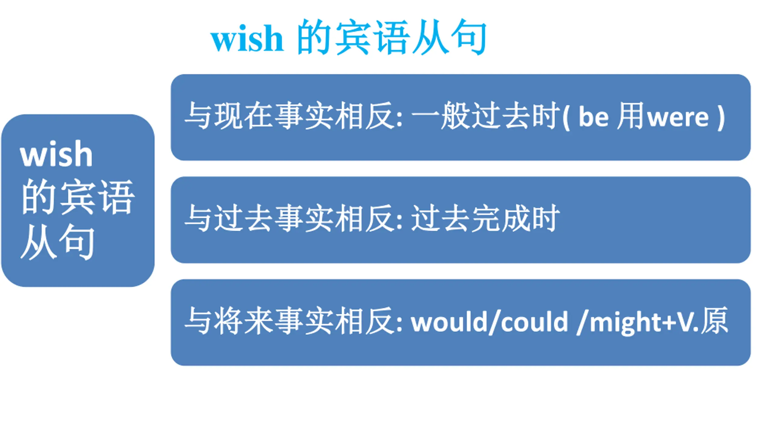 wish 的宾语从句 的宾语从句 与现在事实相反 与现在事实相反: 一般过去时 一般过去时( be 用 用were ) wish 的宾语 的宾语 从句 从句 与过去事实相反 与过去事实相反: 过去完成时 过去完成时 与将来事实相反 与将来事实相反: would/could /might+V.原 原