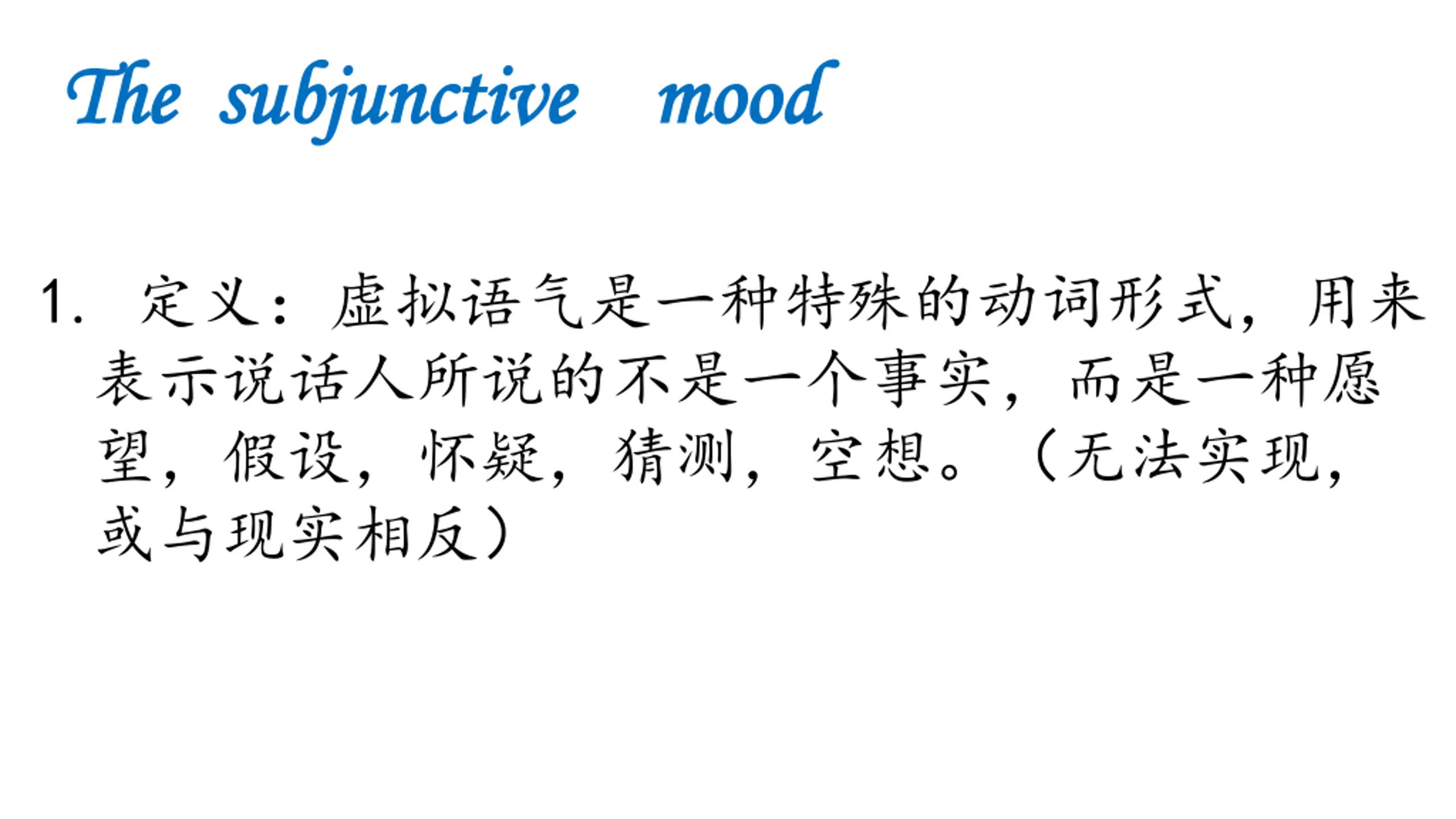The The subjunctive subjunctive mood mood 1. 定义:虚拟语气是一种特殊的动词形式,用来 表示说话人所说的不是一个事实,而是一种愿 望,假设,怀疑,猜测,空想。(无法实现, 或与现实相反)