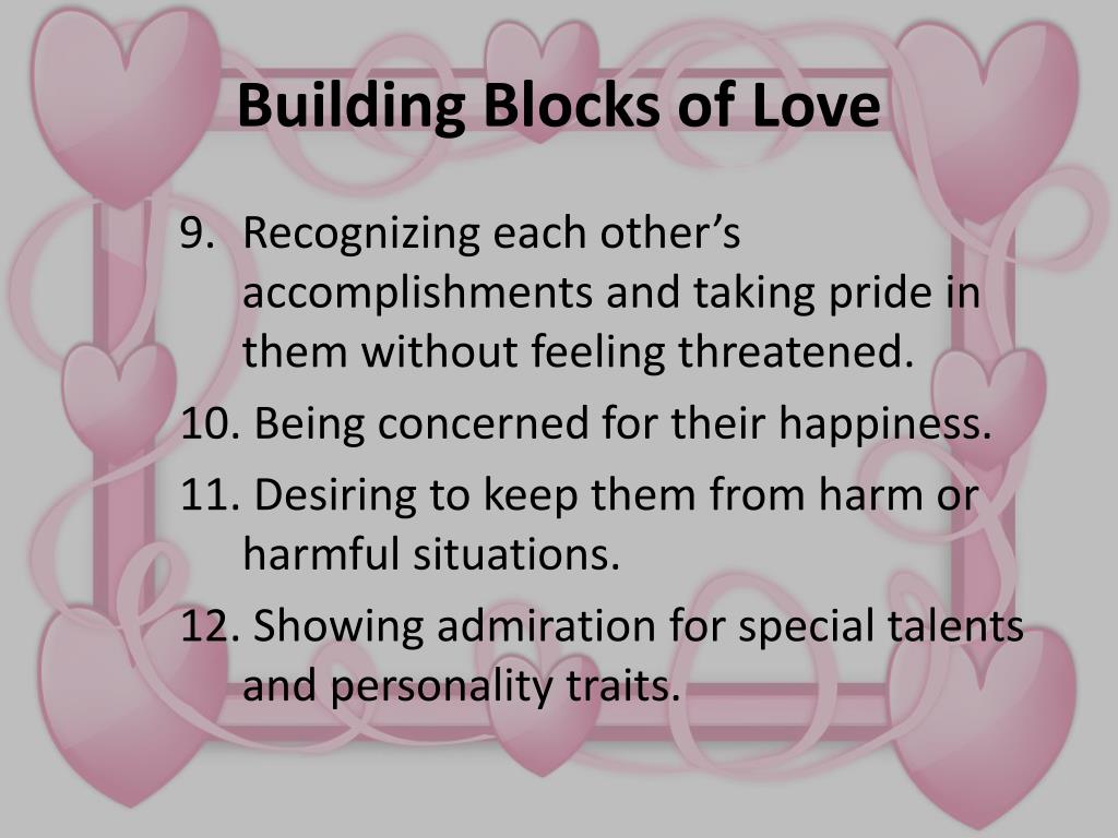 Building Blocks of Love • Recognizing each other’s accomplishments and taking pride in them without feeling threatened. • Being concerned for their happiness. • Desiring to keep them from harm or harmful situations. • Showing admiration for special talents and personality traits.