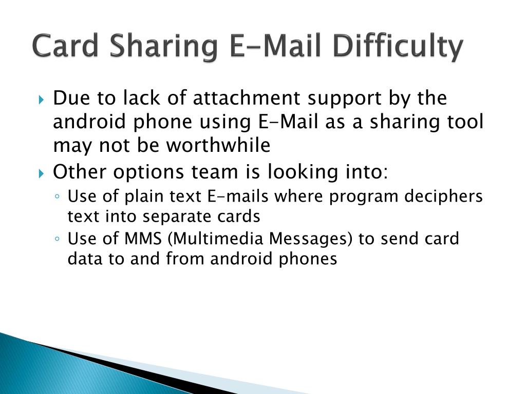 Card Sharing E-Mail Difficulty • Due to lack of attachment support by the android phone using E-Mail as a sharing tool may not be worthwhile • Other options team is looking into: • Use of plain text E-mails where program deciphers text into separate cards • Use of MMS (Multimedia Messages) to send card data to and from android phones
