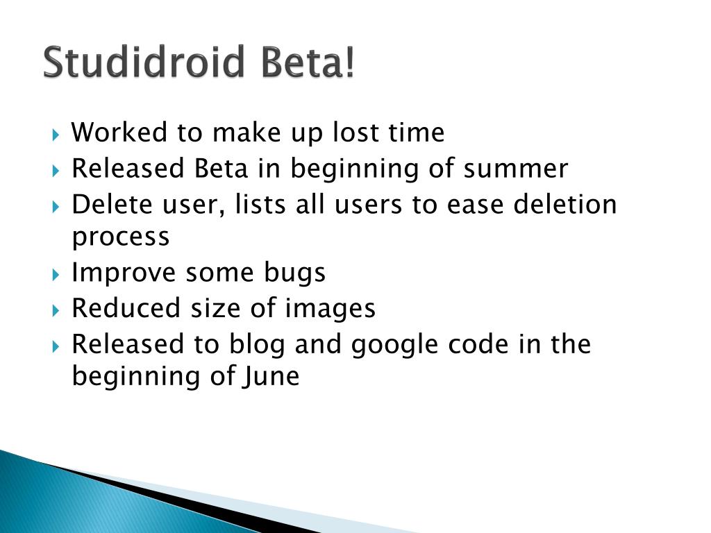 Studidroid Beta! • Worked to make up lost time • Released Beta in beginning of summer • Delete user, lists all users to ease deletion process • Improve some bugs • Reduced size of images • Released to blog and google code in the beginning of June