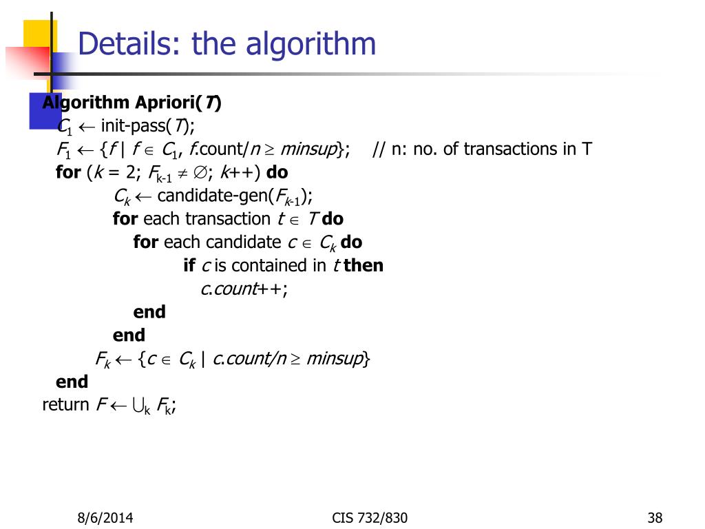 Details: the algorithm Algorithm Apriori(T) C1 init-pass(T); F1 {f | fC1, f.count/nminsup}; // n: no. of transactions in T for (k = 2; Fk-1; k++) do Ck candidate-gen(Fk-1); for each transaction tTdo for each candidate cCkdo ifc is contained in tthen c.count++; end end Fk {cCk | c.count/nminsup} end return FkFk; CIS 732/830