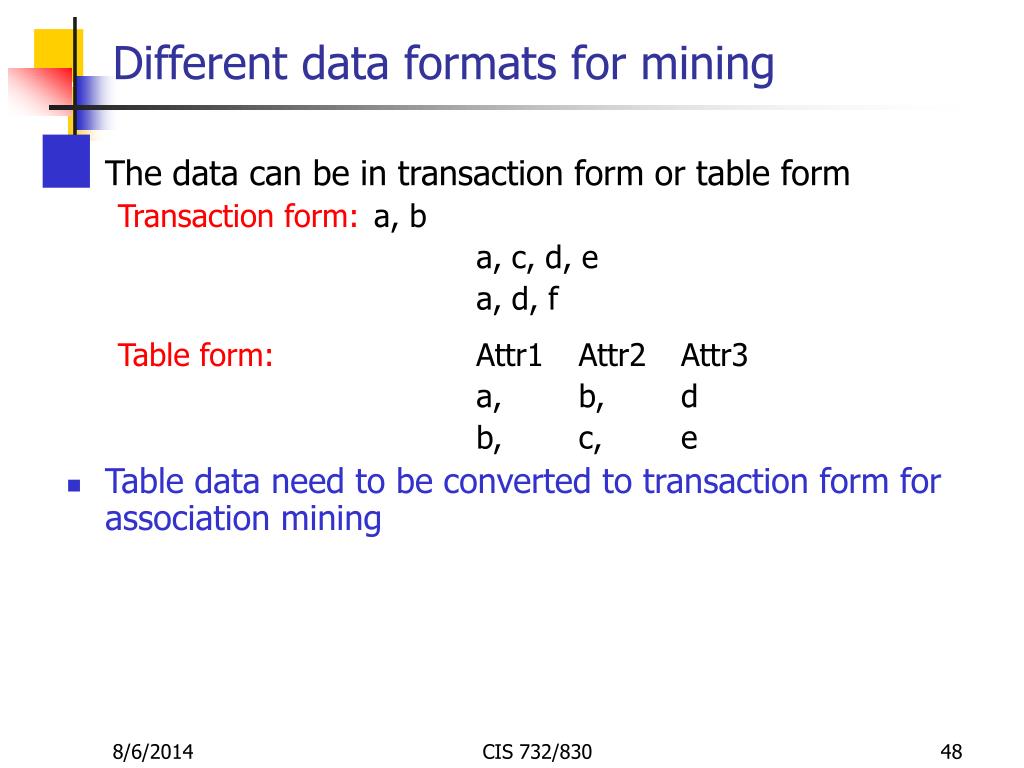 Different data formats for mining • The data can be in transaction form or table form Transaction form: a, b a, c, d, e a, d, f Table form: Attr1 Attr2 Attr3 a, b, d b, c, e • Table data need to be converted to transaction form for association mining CIS 732/830