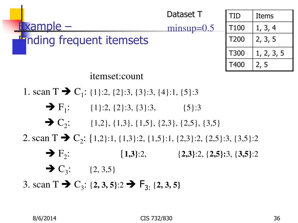 Example – Finding frequent itemsets Dataset T minsup=0.5 • itemset:count • 1. scan T C1: {1}:2, {2}:3, {3}:3, {4}:1, {5}:3 • F1: {1}:2, {2}:3, {3}:3, {5}:3 • C2: {1,2}, {1,3}, {1,5}, {2,3}, {2,5}, {3,5} • 2.scan T C2: {1,2}:1, {1,3}:2, {1,5}:1, {2,3}:2, {2,5}:3, {3,5}:2 • F2: {1,3}:2, {2,3}:2, {2,5}:3, {3,5}:2 • C3:{2, 3,5} • 3. scan T C3: {2, 3, 5}:2 F3: {2, 3, 5} CIS 732/830