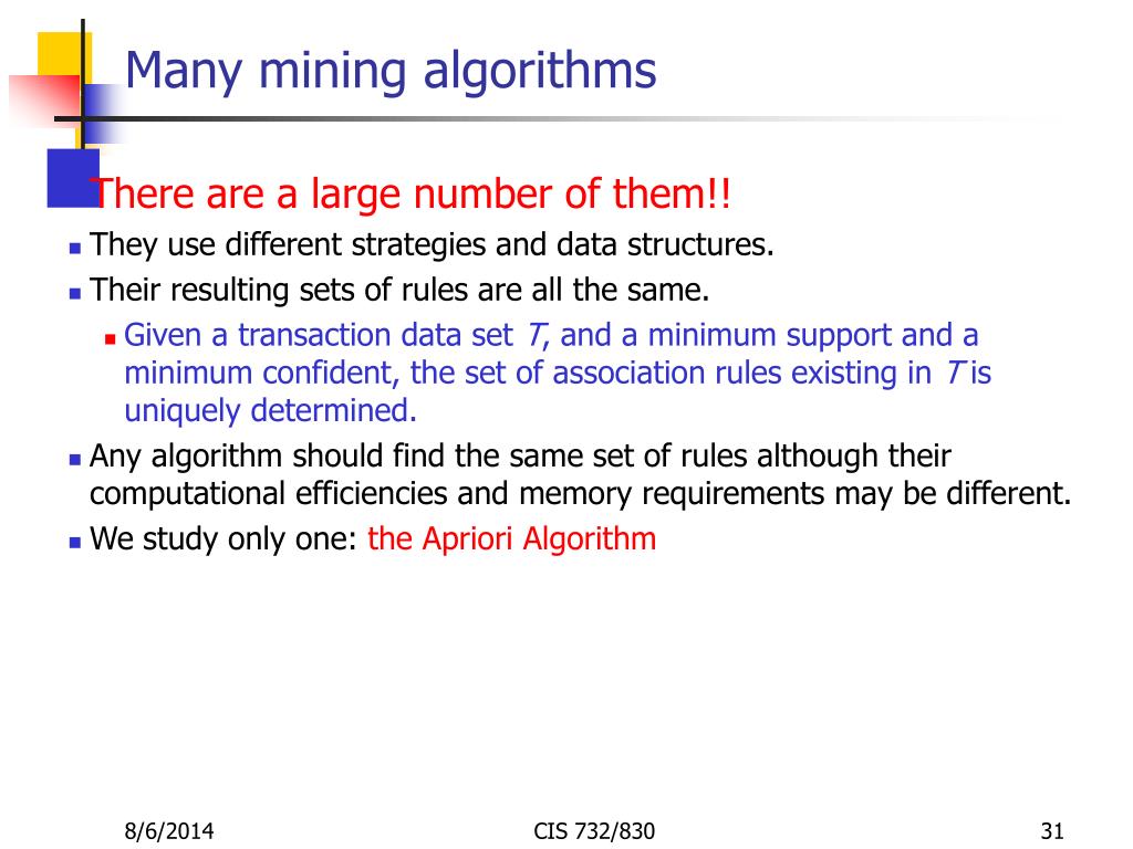 Many mining algorithms • There are a large number of them!! • They use different strategies and data structures. • Their resulting sets of rules are all the same. • Given a transaction data set T, and a minimum support and a minimum confident, the set of association rules existing in T is uniquely determined. • Any algorithm should find the same set of rules although their computational efficiencies and memory requirements may be different. • We study only one: the Apriori Algorithm CIS 732/830