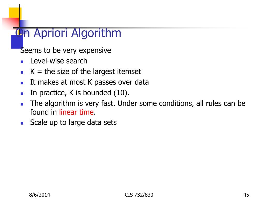 On Apriori Algorithm Seems to be very expensive • Level-wise search • K = the size of the largest itemset • It makes at most K passes over data • In practice, K is bounded (10). • The algorithm is very fast. Under some conditions, all rules can be found in linear time. • Scale up to large data sets CIS 732/830