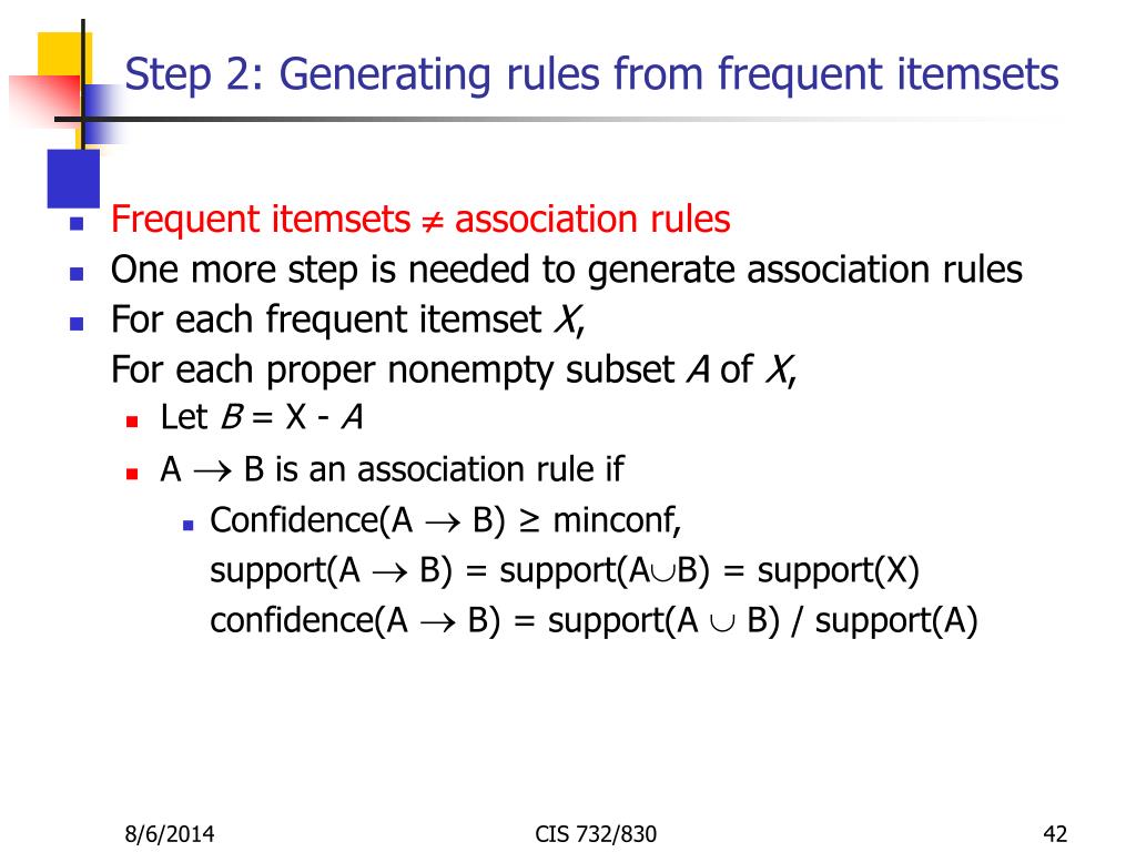 Step 2: Generating rules from frequent itemsets • Frequent itemsets association rules • One more step is needed to generate association rules • For each frequent itemset X, For each proper nonempty subset A of X, • Let B = X - A • A B is an association rule if • Confidence(A B) ≥ minconf, support(A B) = support(AB) = support(X) confidence(A B) = support(A B) / support(A) CIS 732/830
