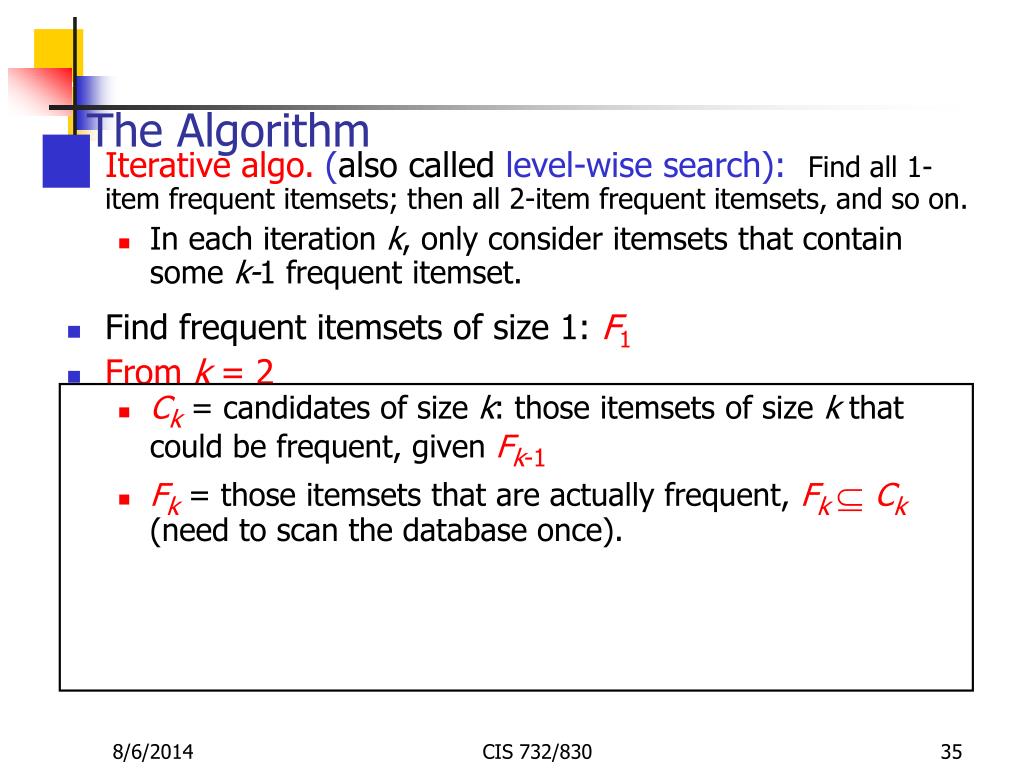The Algorithm • Iterative algo. (also called level-wise search):Find all 1-item frequent itemsets; then all 2-item frequent itemsets, and so on. • In each iteration k, only consider itemsets that contain some k-1 frequent itemset. • Find frequent itemsets of size 1: F1 • From k = 2 • Ck= candidates of size k: those itemsets of size k that could be frequent, given Fk-1 • Fk= those itemsets that are actually frequent, Fk Ck(need to scan the database once). CIS 732/830
