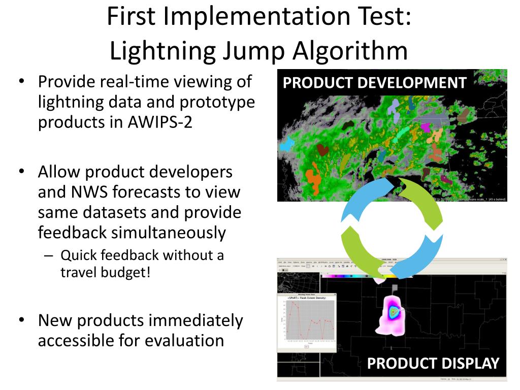 First Implementation Test: Lightning Jump Algorithm PRODUCT DEVELOPMENT • Provide real-time viewing of lightning data and prototype products in AWIPS-2 • Allow product developers and NWS forecasts to view same datasets and provide feedback simultaneously • Quick feedback without a travel budget! • New products immediately accessible for evaluation PRODUCT DISPLAY