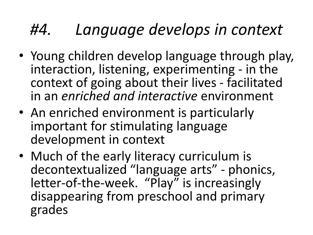 #4. Language develops in context • Young children develop language through play, interaction, listening, experimenting - in the context of going about their lives - facilitated in an enriched and interactiveenvironment • An enriched environment is particularly important for stimulating language development in context • Much of the early literacy curriculum is decontextualized “language arts” - phonics, letter-of-the-week. “Play” is increasingly disappearing from preschool and primary grades