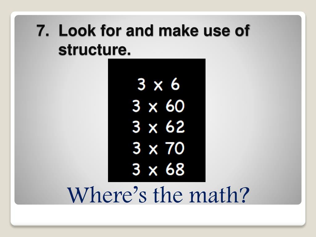 In your groups: *Read description of the given mathematical practice *Discuss within your group *Determine examples of lessons, activities, etc. that fit your practice; record on chart paper *Describe how it looks in the classroom • What is the teacher doing? • What are the students doing? ACTIVITY: Mathematical Practices