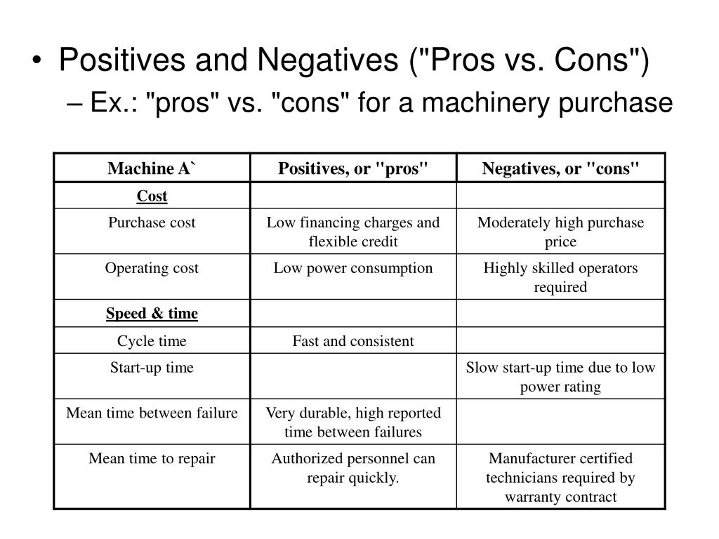 Positives and Negatives ("Pros vs. Cons") • Ex.: "pros" vs. "cons" for a machinery purchase