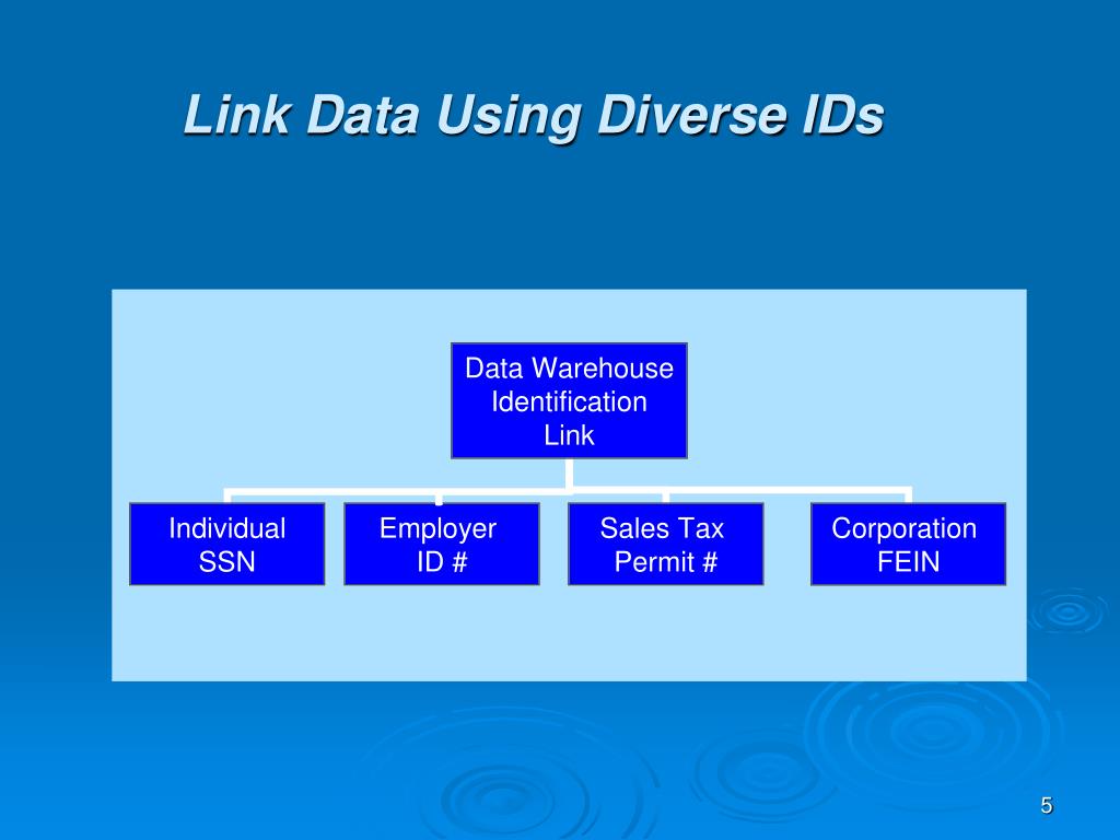 Model Data Using Common IDs State Federal Driver Property Other Tax Tax License Tax State Return ReturnDataDataAgency SSN SSN SSN SSN SSN FEIN FEIN FEIN FEIN