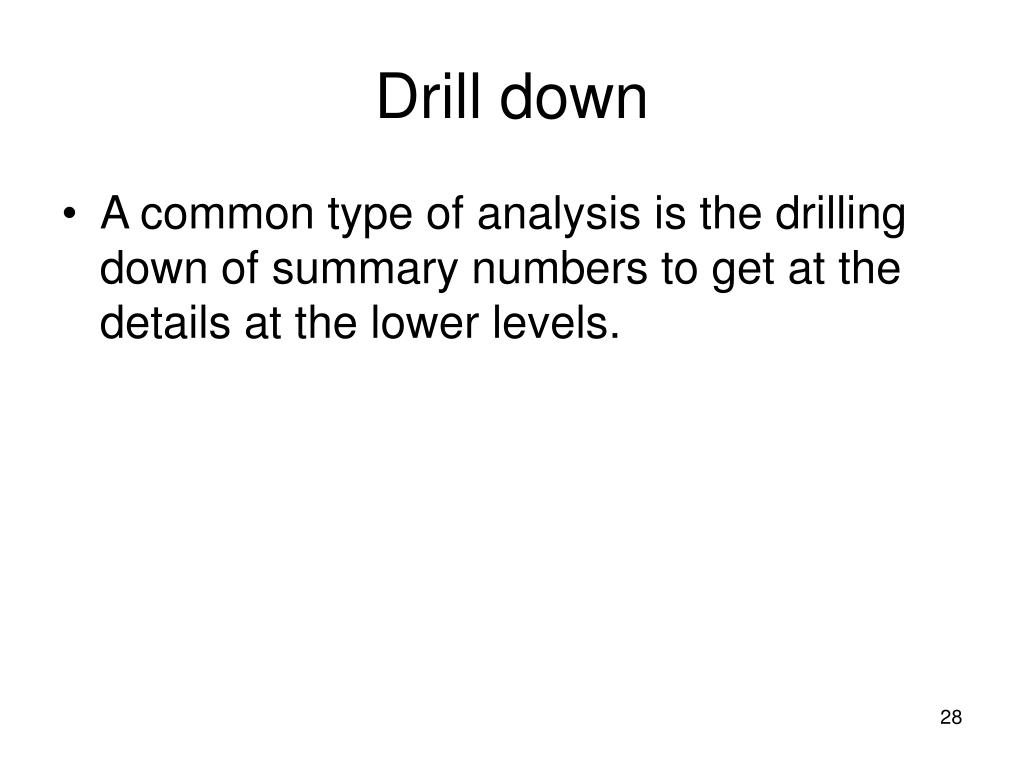 Drill down • A common type of analysis is the drilling down of summary numbers to get at the details at the lower levels.