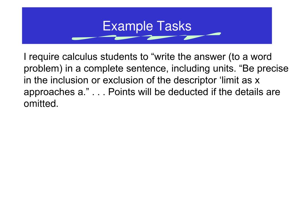 Example Tasks I require calculus students to “write the answer (to a word problem) in a complete sentence, including units. “Be precise in the inclusion or exclusion of the descriptor ‘limit as x approaches a.” . . . Points will be deducted if the details are omitted.
