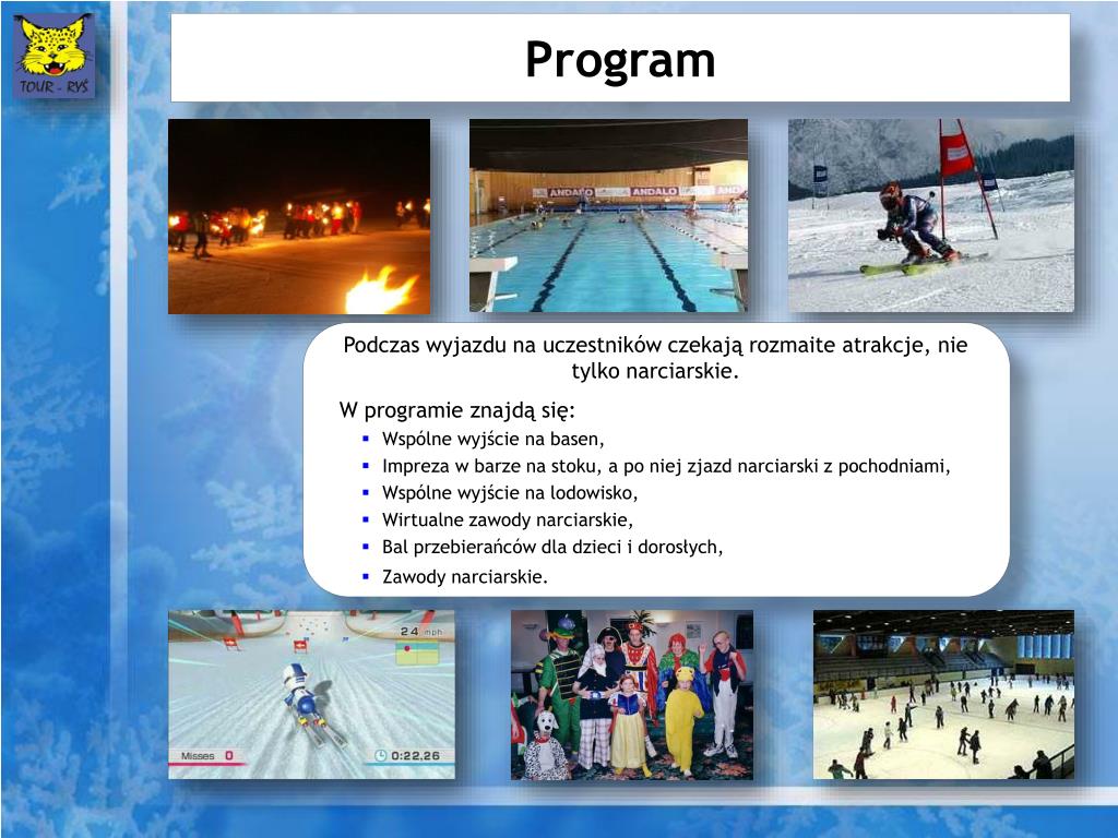 Program • Podczas wyjazdu na uczestników czekają rozmaite atrakcje, nie tylko narciarskie. • W programie znajdą się: • Wspólne wyjście na basen, • Impreza w barze na stoku, a po niej zjazd narciarski z pochodniami, • Wspólne wyjście na lodowisko, • Wirtualne zawody narciarskie, • Bal przebierańców dla dzieci i dorosłych, • Zawody narciarskie.