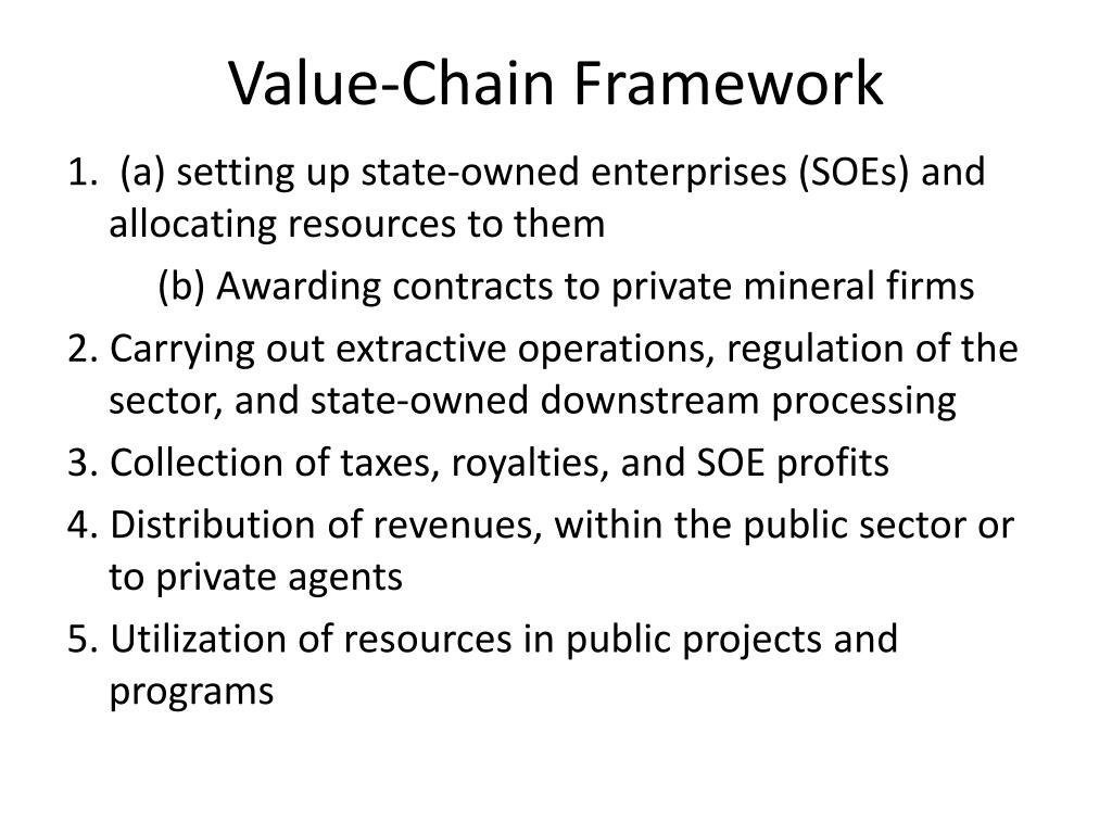 Value-Chain Framework 1. (a) setting up state-owned enterprises (SOEs) and allocating resources to them (b) Awarding contracts to private mineral firms 2. Carrying out extractive operations, regulation of the sector, and state-owned downstream processing 3. Collection of taxes, royalties, and SOE profits 4. Distribution of revenues, within the public sector or to private agents 5. Utilization of resources in public projects and programs