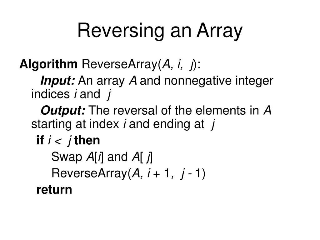 Reversing an Array Algorithm ReverseArray(A, i, j): Input: An array A and nonnegative integer indices i and j Output: The reversal of the elements in A starting at index i and ending at j if i < j then Swap A[i] and A[ j] ReverseArray(A, i + 1, j - 1) return