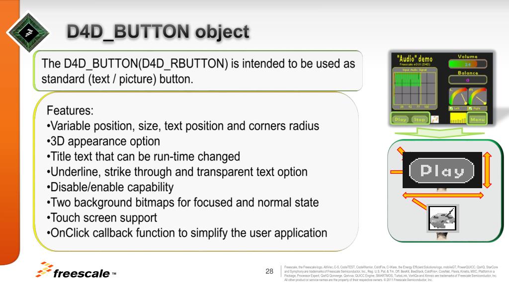 Freescale eGUI driver memory footprint • The worst case is about 54KB Flash / ~194 B RAM: • all objects used • round corners are enabled • bitmap decoders • Same project without round corners and some bitmap decoders is 45KB (still all objects) • Typical footprint – 45KB