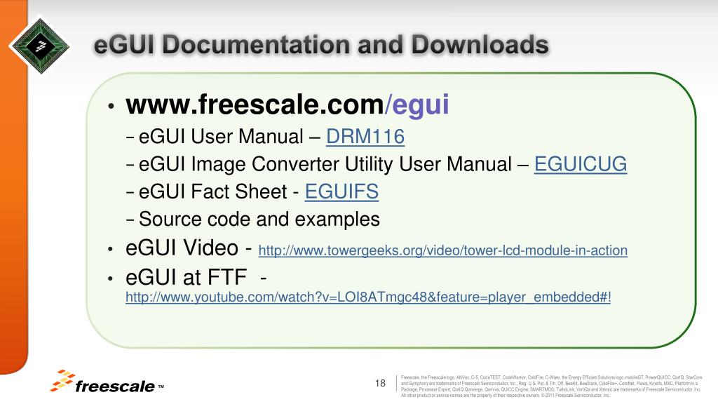 eGUI Documentation and Downloads • www.freescale.com/egui • eGUI User Manual – DRM116 • eGUI Image Converter Utility User Manual – EGUICUG • eGUI Fact Sheet - EGUIFS • Source code and examples • eGUI Video - http://www.towergeeks.org/video/tower-lcd-module-in-action • eGUI at FTF - http://www.youtube.com/watch?v=LOI8ATmgc48&feature=player_embedded#!