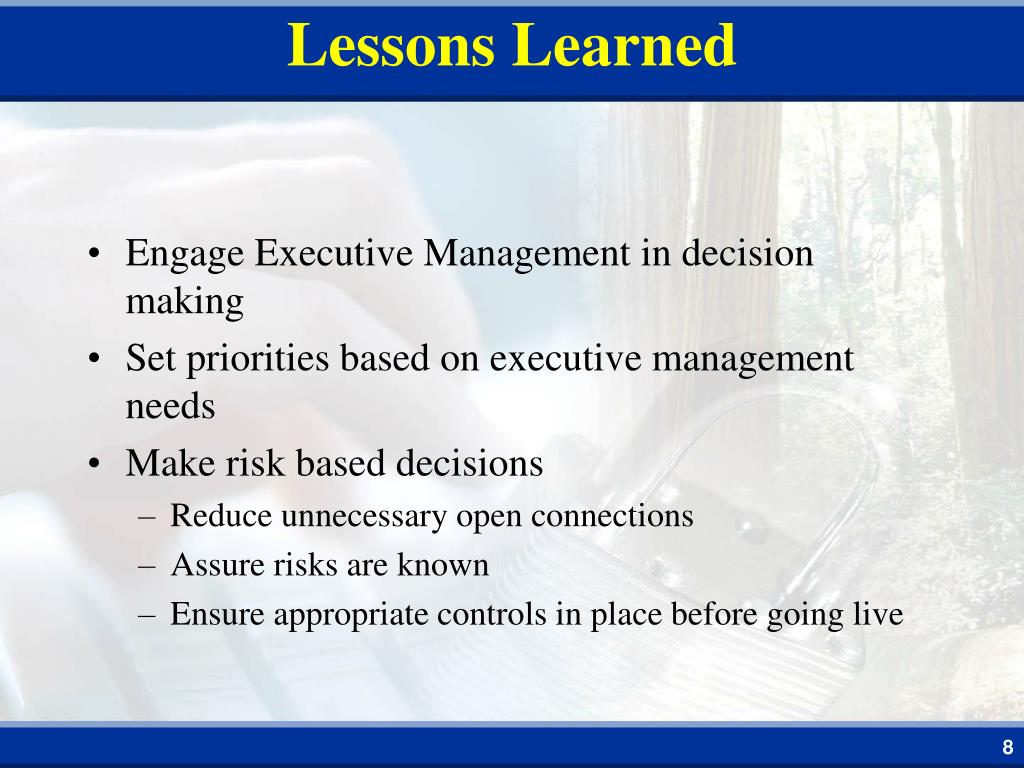Engage Executive Management in decision making Set priorities based on executive management needs Make risk based decisions Reduce unnecessary open connections Assure risks are known Ensure appropriate controls in place before going live Lessons Learned