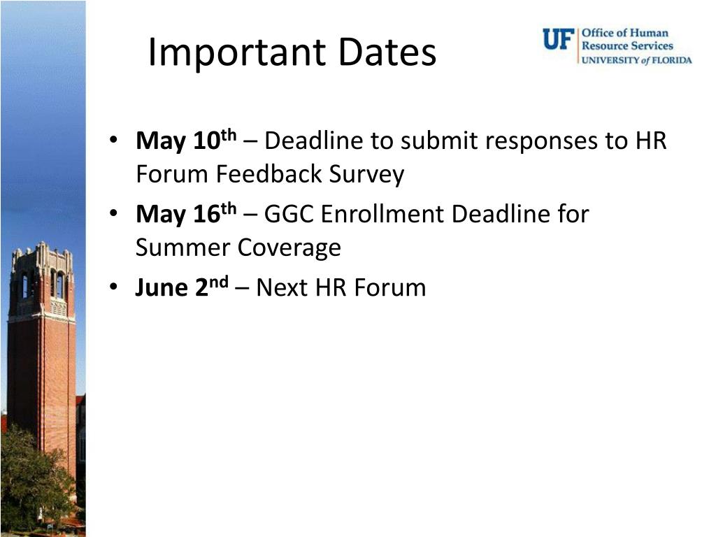 Important Dates • May 10th– Deadline to submit responses to HR Forum Feedback Survey • May 16th– GGC Enrollment Deadline for Summer Coverage • June 2nd – Next HR Forum