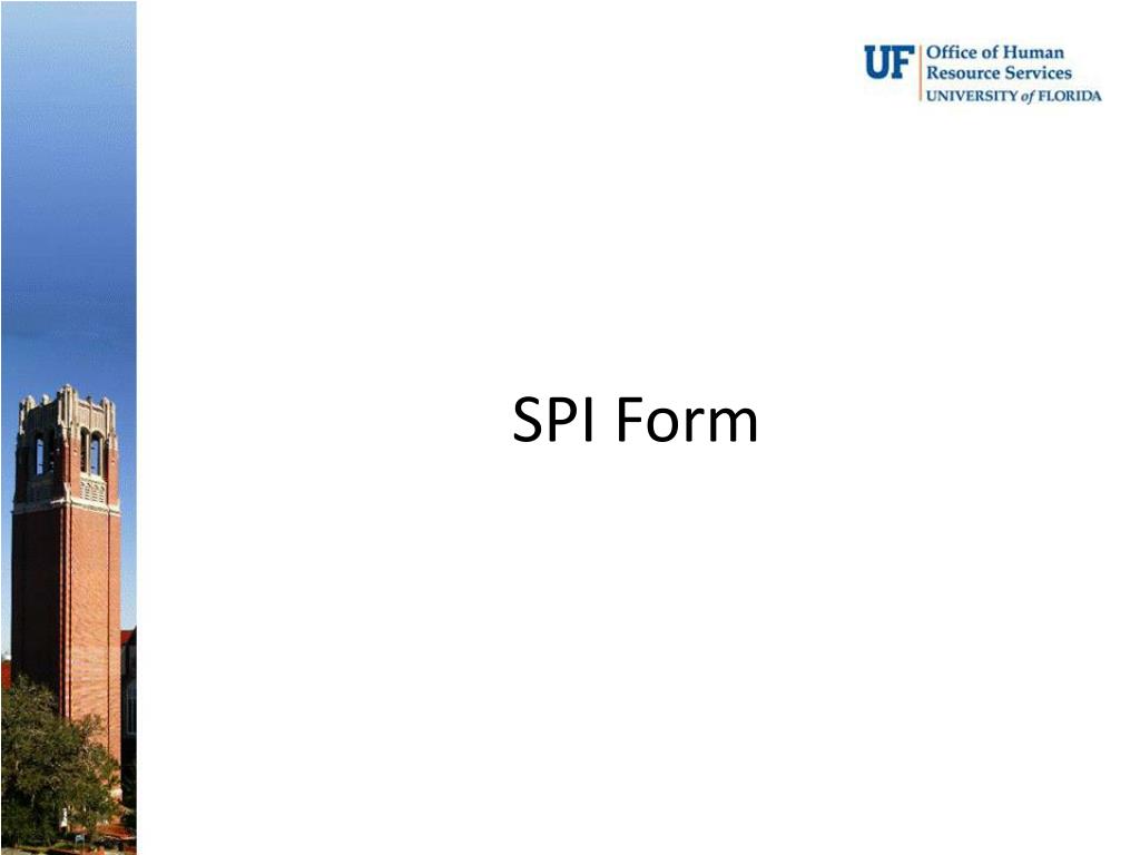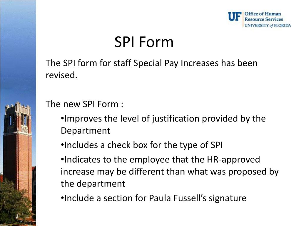 SPI Form The SPI form for staff Special Pay Increases has been revised. The new SPI Form : Improves the level of justification provided by the Department Includes a check box for the type of SPI Indicates to the employee that the HR-approved increase may be different than what was proposed by the department Include a section for Paula Fussell’s signature