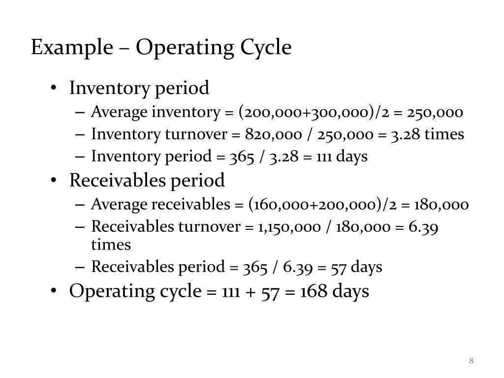 Example – Operating Cycle • Inventory period • Average inventory = (200,000+300,000)/2 = 250,000 • Inventory turnover = 820,000 / 250,000 = 3.28 times • Inventory period = 365 / 3.28 = 111 days • Receivables period • Average receivables = (160,000+200,000)/2 = 180,000 • Receivables turnover = 1,150,000 / 180,000 = 6.39 times • Receivables period = 365 / 6.39 = 57 days • Operating cycle = 111 + 57 = 168 days