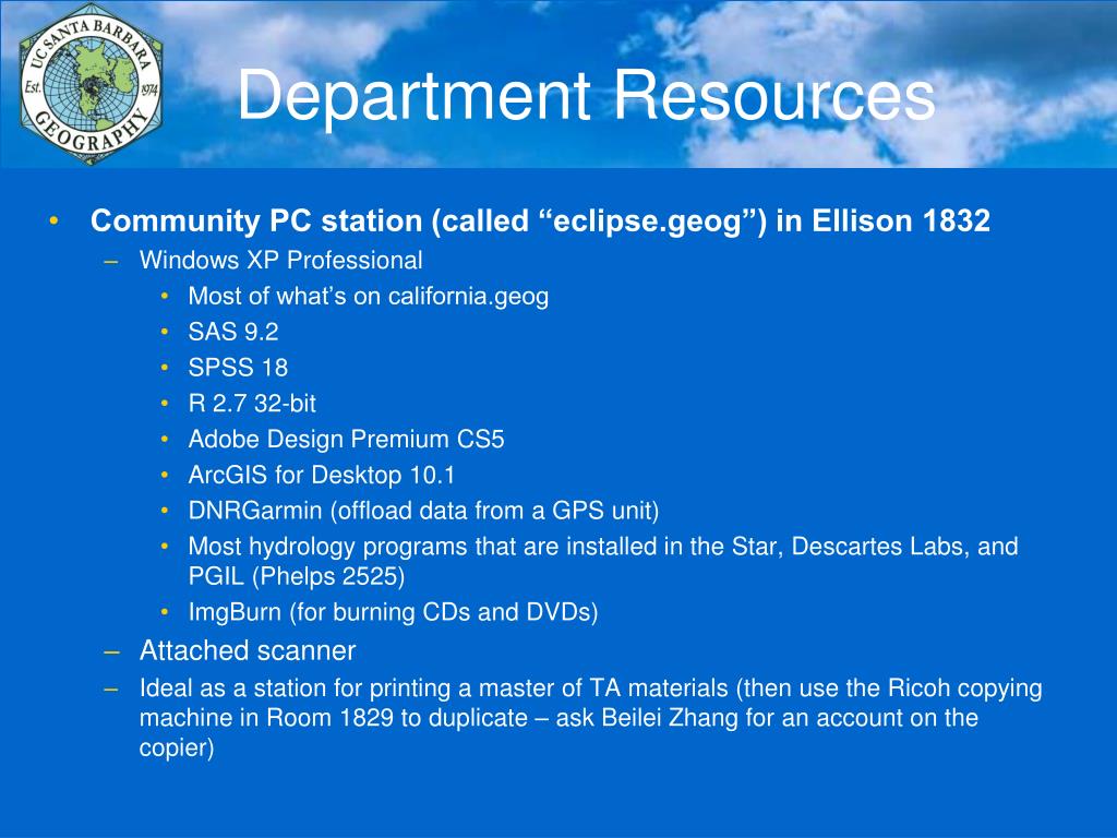 Department Resources • Community PC station (called “eclipse.geog”) in Ellison 1832 • Windows XP Professional • Most of what’s on california.geog • SAS 9.2 • SPSS 18 • R 2.7 32-bit • Adobe Design Premium CS5 • ArcGIS for Desktop 10.1 • DNRGarmin (offload data from a GPS unit) • Most hydrology programs that are installed in the Star, Descartes Labs, and PGIL (Phelps 2525) • ImgBurn (for burning CDs and DVDs) • Attached scanner • Ideal as a station for printing a master of TA materials (then use the Ricoh copying machine in Room 1829 to duplicate – ask Beilei Zhang for an account on the copier)