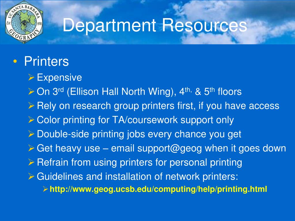 Department Resources • Printers • Expensive • On 3rd (Ellison Hall North Wing), 4th, & 5th floors • Rely on research group printers first, if you have access • Color printing for TA/coursework support only • Double-side printing jobs every chance you get • Get heavy use – email support@geog when it goes down • Refrain from using printers for personal printing • Guidelines and installation of network printers: • http://www.geog.ucsb.edu/computing/help/printing.html