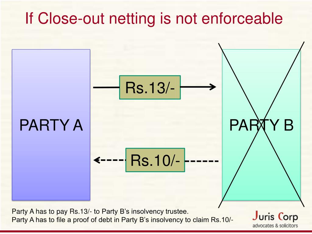 If Close-out netting is not enforceable PARTY A PARTY B Rs.13/- Rs.10/- Party A has to pay Rs.13/- to Party B’s insolvency trustee. Party A has to file a proof of debt in Party B’s insolvency to claim Rs.10/-