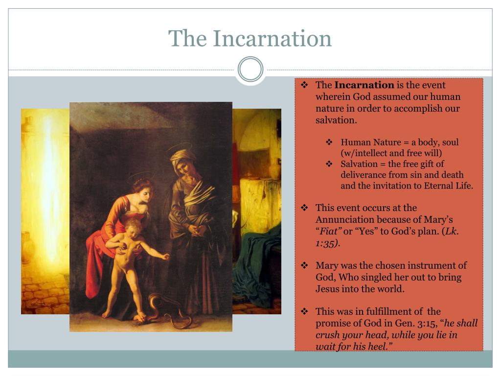 The Incarnation • The Incarnation is the event wherein God assumed our human nature in order to accomplish our salvation. • Human Nature = a body, soul (w/intellect and free will) • Salvation = the free gift of deliverance from sin and death and the invitation to Eternal Life. • This event occurs at the Annunciation because of Mary’s “Fiat” or “Yes” to God’s plan. (Lk. 1:35). • Mary was the chosen instrument of God, Who singled her out to bring Jesus into the world. • This was in fulfillment of the promise of God in Gen. 3:15, “he shall crush your head, while you lie in wait for his heel.”