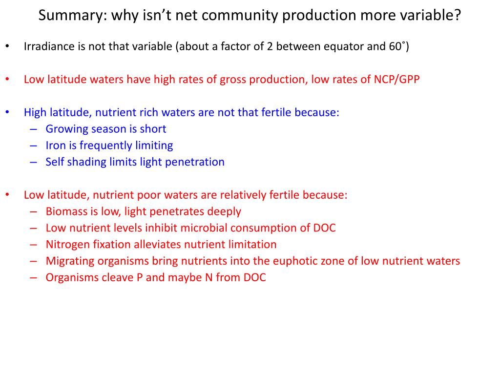 Summary: why isn’t net community production more variable? • Irradiance is not that variable (about a factor of 2 between equator and 60˚) • Low latitude waters have high rates of gross production, low rates of NCP/GPP • High latitude, nutrient rich waters are not that fertile because: • Growing season is short • Iron is frequently limiting • Self shading limits light penetration • Low latitude, nutrient poor waters are relatively fertile because: • Biomass is low, light penetrates deeply • Low nutrient levels inhibit microbial consumption of DOC • Nitrogen fixation alleviates nutrient limitation • Migrating organisms bring nutrients into the euphotic zone of low nutrient waters • Organisms cleave P and maybe N from DOC