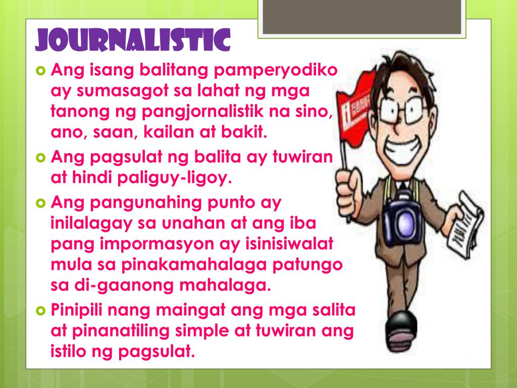 JOURNALISTIC • Angisangbalitangpamperyodiko ay sumasagotsalahatngmgatanongngpangjornalistiknasino, ano, saan, kailan at bakit. • Angpagsulatngbalita ay tuwiran at hindipaliguy-ligoy. • Angpangunahingpunto ay inilalagaysaunahan at angiba pang impormasyon ay isinisiwalatmulasapinakamahalagapatungosa di-gaanongmahalaga. • Pinipilinangmaingatangmgasalita at pinanatiling simple at tuwiranangistilongpagsulat.