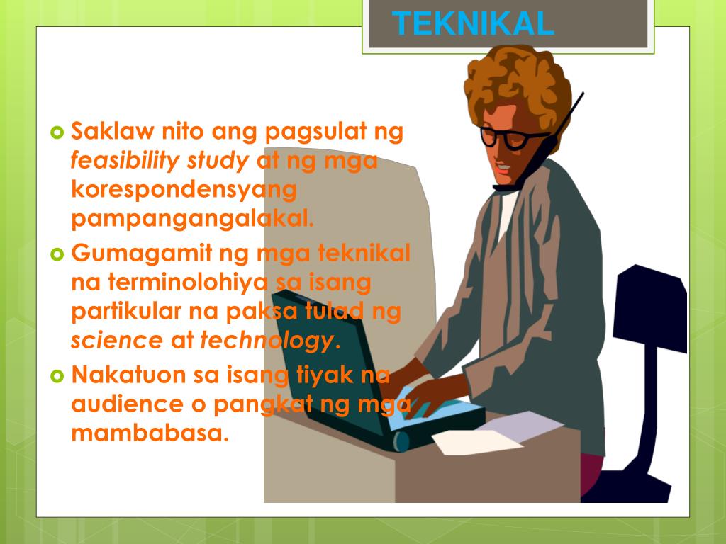 TEKNIKAL • Saklawnitoangpagsulatngfeasibility study at ngmgakorespondensyangpampangangalakal. • Gumagamitngmgateknikalnaterminolohiyasaisangpartikularnapaksatuladngscience at technology. • Nakatuonsaisangtiyakna audience o pangkatngmgamambabasa.