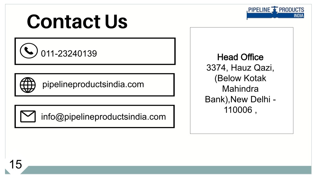info@pipelineproductsindia.com ContactUs 011-23240139 Head Office 3374, Hauz Qazi, (Below Kotak Mahindra Bank),New Delhi - 110006 , pipelineproductsindia.com 15