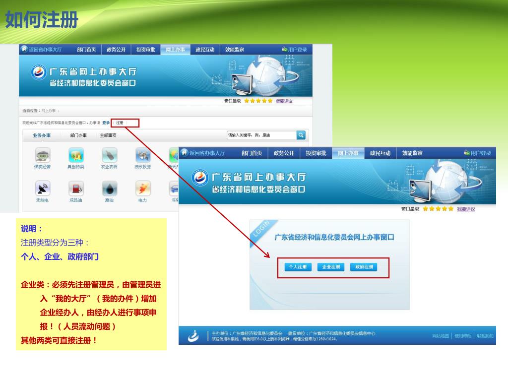 如何注册 说明: 注册类型分为三种: 个人、企业、政府部门 企业类:必须先注册管理员,由管理员进入“我的大厅”(我的办件)增加企业经办人,由经办人进行事项申报!(人员流动问题) 其他两类可直接注册!