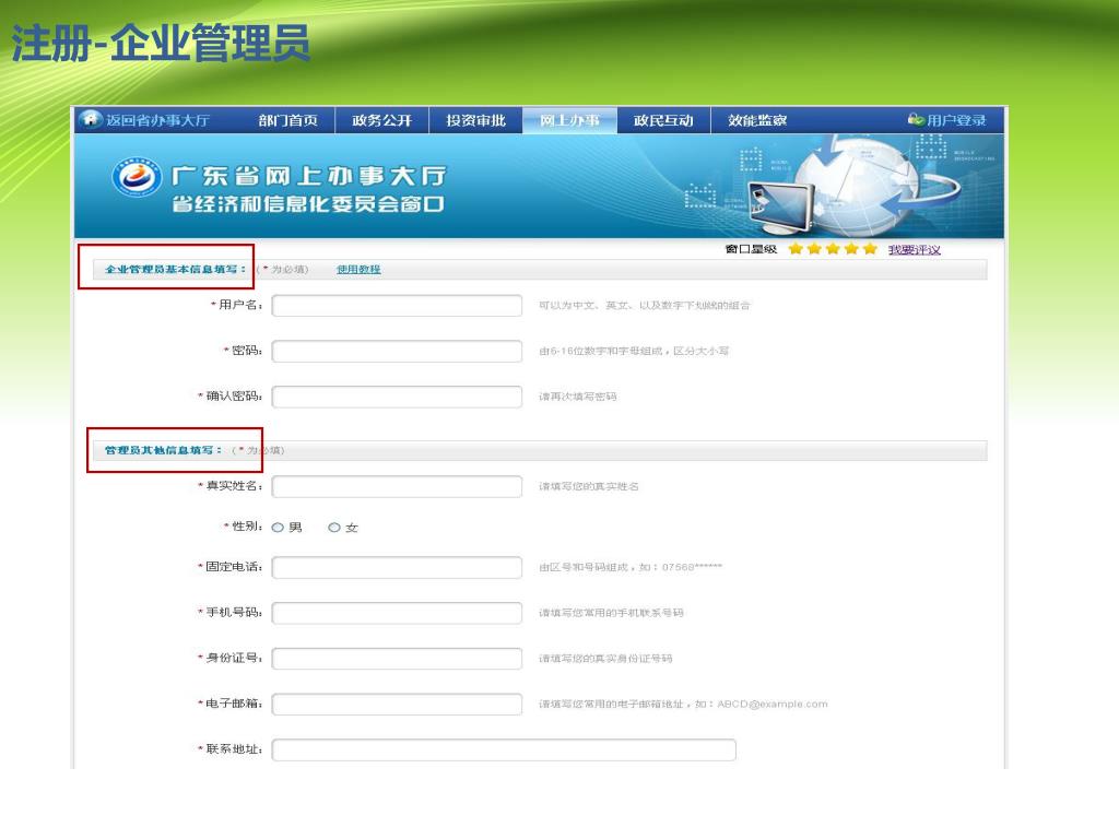 省经济和信息化委网上办事窗口 申报系统 简易操作指南. 广东省经济和信息化委员会信息中心. 目录. 如何注册? 如何获取应用指南? 如何在线申报? 如何确定申报成功? (辅) 如何递交 纸质材料? (辅) 如何跟进办理情况? 如何自主管理?. 注册账号. 事项申请. 阅读指南. 准备材料. 在线申报. 1. 申报回执. 递交纸质材料. 收件凭证. 事项审批. 2. 补正通知. 受理通知. ……. 认识系统. 4. 固定信息栏目区. 5. 用户注册登录区. 1. 事项申办区. 2. 事项办理信息区. 3.