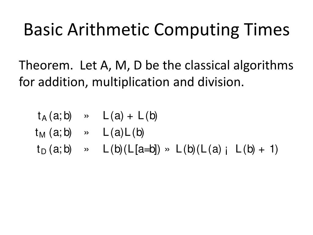 Basic Arithmetic Computing Times Theorem. Let A, M, D be the classical algorithms for addition, multiplication and division.