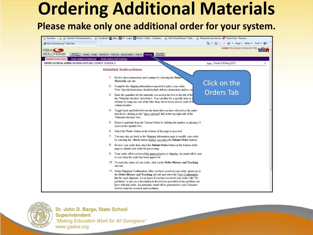 Ordering Additional MaterialsPlease make only one additional order for your system. Click on the Orders Tab