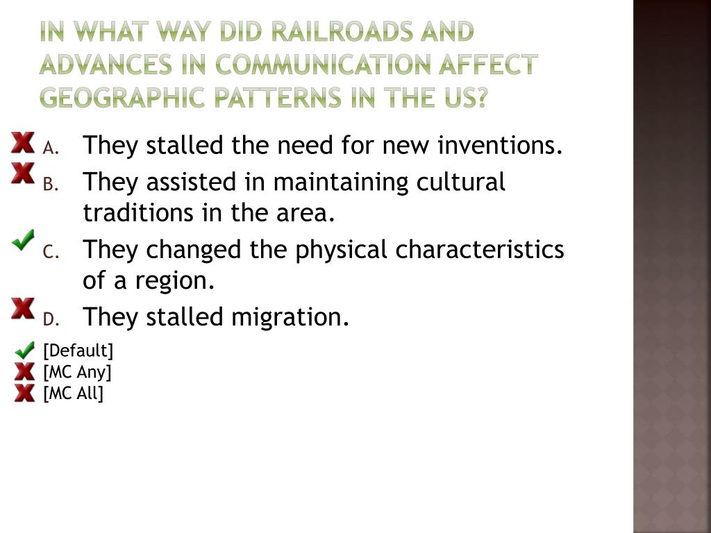 In what way did railroads and advances in communication affect geographic patterns in the US? • They stalled the need for new inventions. • They assisted in maintaining cultural traditions in the area. • They changed the physical characteristics of a region. • They stalled migration. [Default] [MC Any] [MC All]